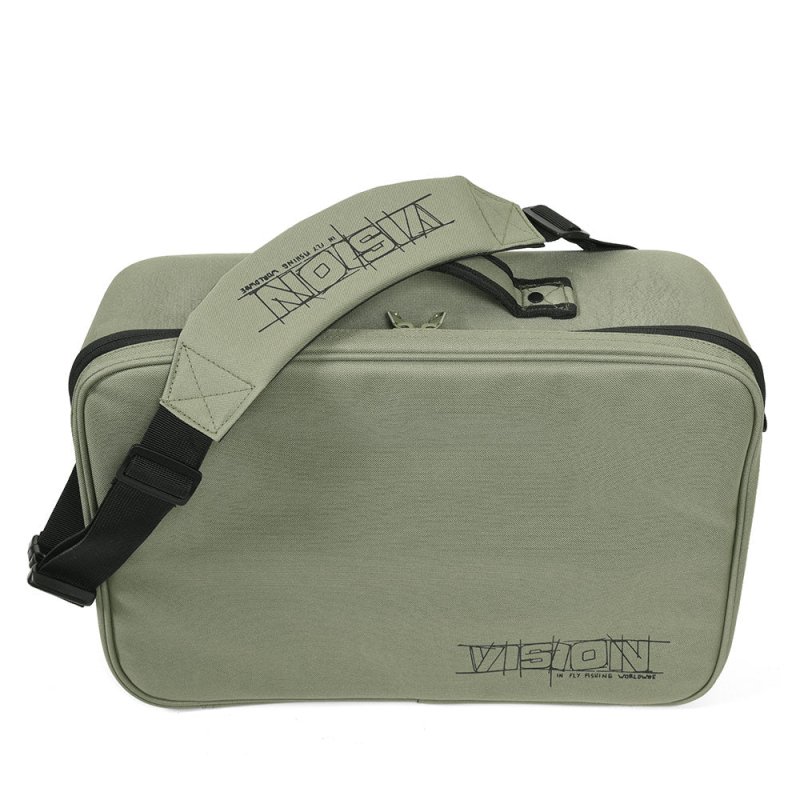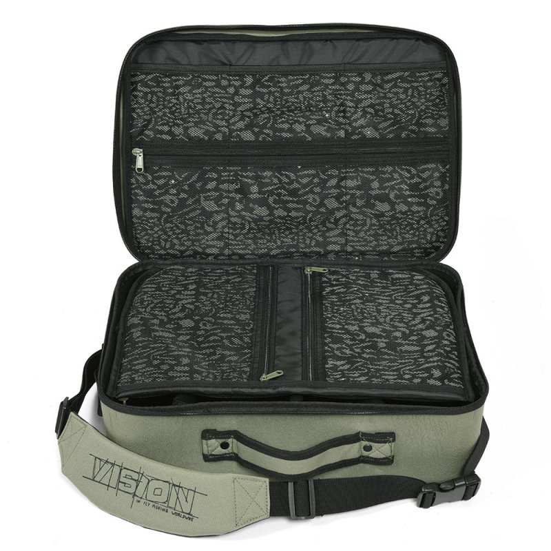 This bag is a real multi-purpose bag for the enthusiastic fly fisherman. It can be used as a spacious reel bag, accommodating a big bunch of differently sized fly reels but thanks to its genius inner wall system you can modify it as you like, according to your needs. In addition to reels you can make a supportive space for your digital SLR or video camera. Or you can use it as a big fly tying bag when travelling. The soft divider gives extra protection when the bag is closed and its numerous zipper pockets keep your small accessories in order and easily accessible. The moulded bottom part is waterproof up to the rivets and stitches, so it can easily be left on the bottom of your boat. Olive green colour scheme.